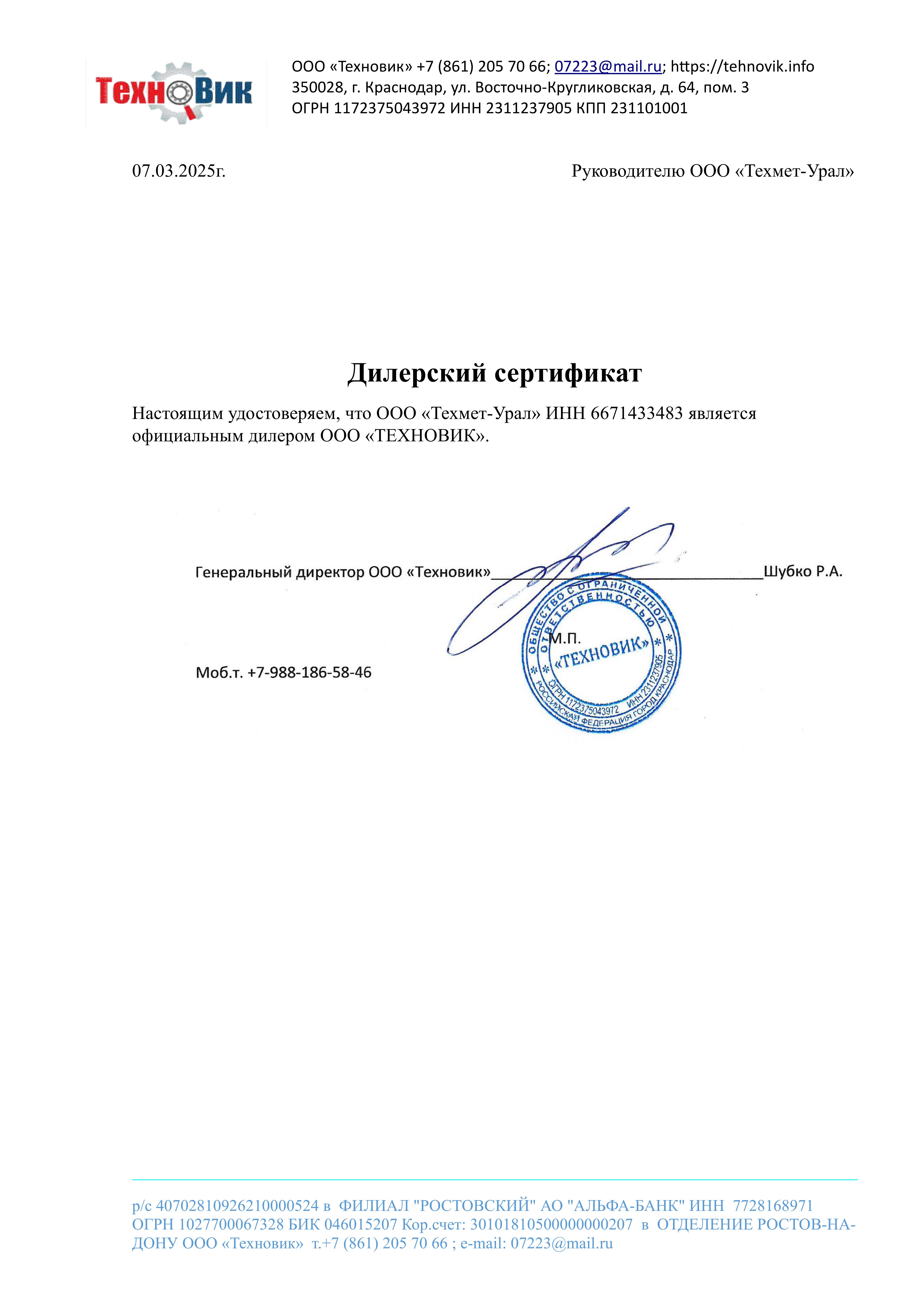 Сертификат дилера компании "ТЕХНОВИК" 1.1 мб
